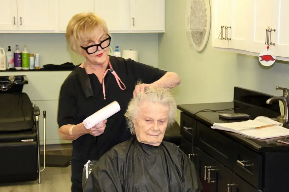 Ready for a new style? Or just need a trim? Our full-service hair salon provides shampoo, cut, style, color, and perm services at a nominal charge. For convenience, residents of assisted living, nursing care, and memory care have access to on-site hair salon services in their locations.